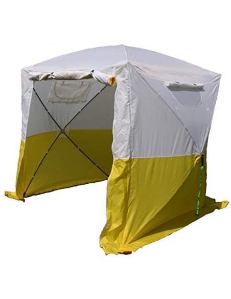 Toile imperméable, arceaux en fibre de verre, accès zippé et fenêtres latérales.