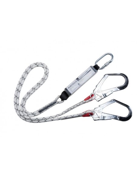Cette double lanière est dotée d'un crochet d'échafaudage et d'un mousqueton. Il mesure 180 cm de long, connecteurs compris.