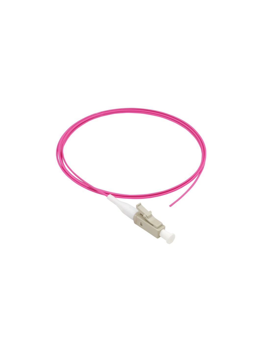 Les pigtails eKivaLAN multimode 2.00 sont constituées d’un câble 900µm magenta hytrel à structure semi-serrée avec une fibre 50/125 µm de qualité OM4 et d’un connecteur LC simplex à embout céramique 1.25mm repéré d’un manchon blanc.
