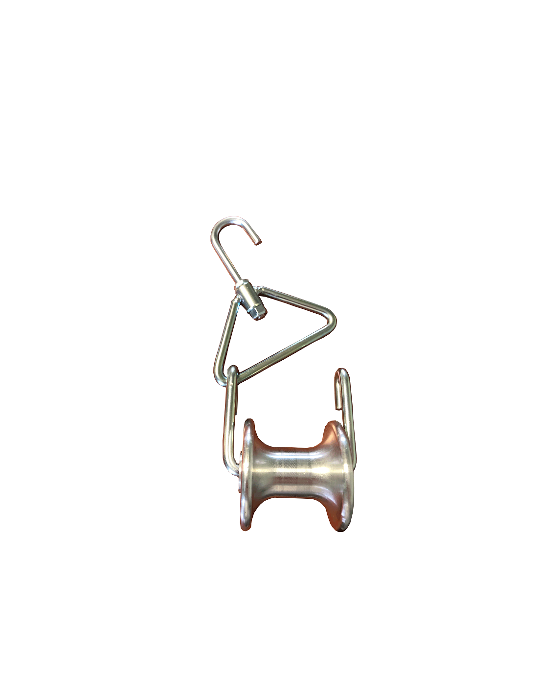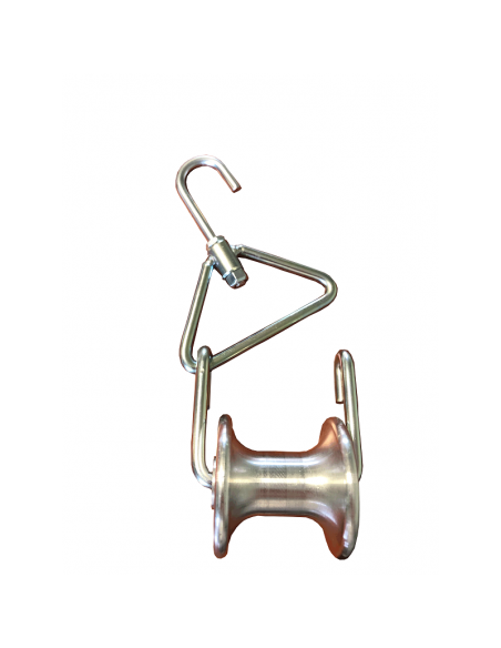 Cette poulie PTT en aluminium est équipée d’un crochet tournant et d’une chape ouvrante, facilitant la mise en place et le retrait des câbles.