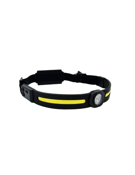 Bandeau réglable, corps en ABS + gel de silice. Détecteur de mouvement pour allumage et extinction. Autonomie 5 h 30 à pleine puissance, 8 h à basse puissance. IP 45. Livré avec câble de charge USB C.