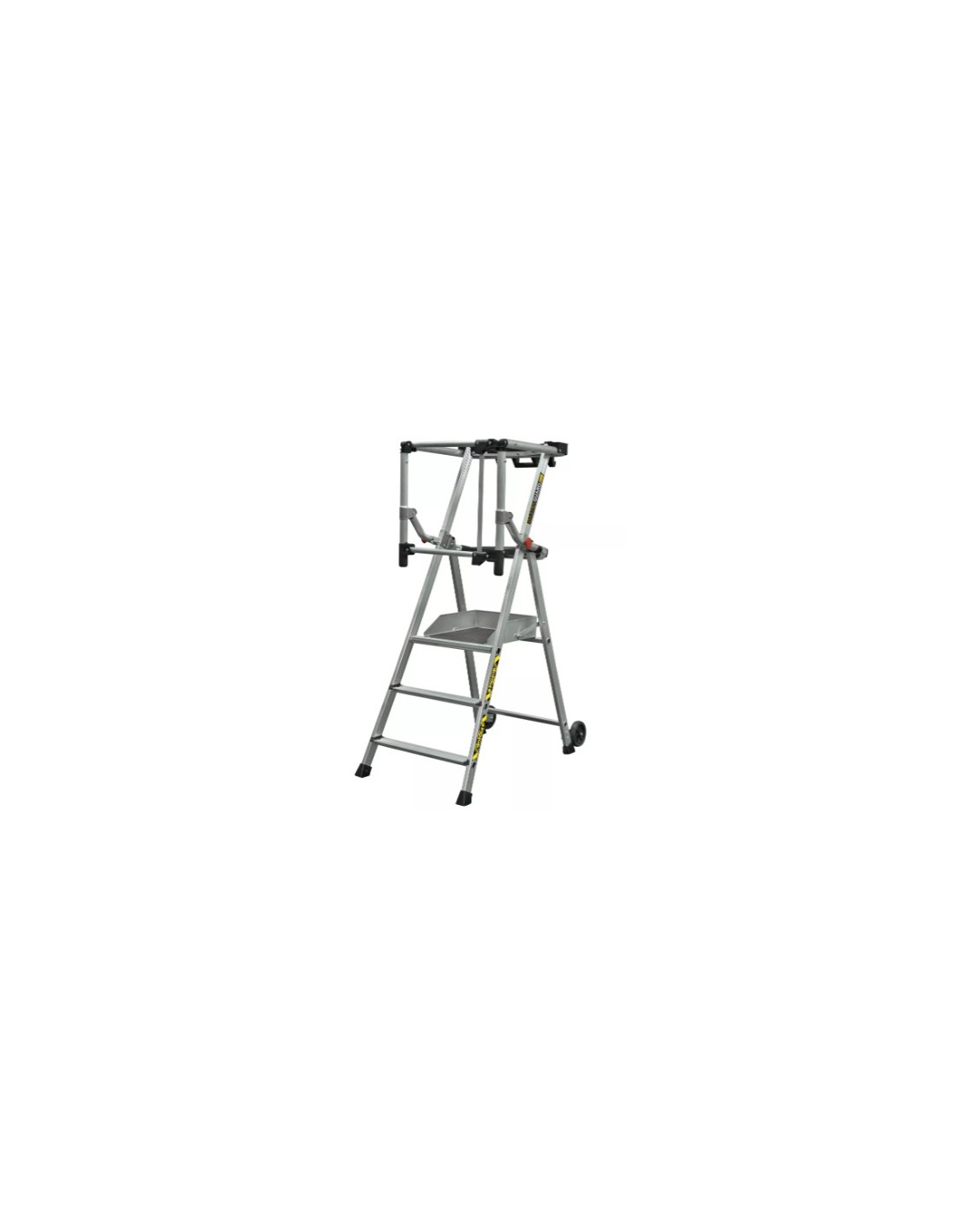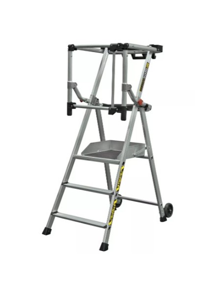 Le système de pantographe breveté à fermeture automatique permet d'accéder facilement et confortablement sur le plancher. Il permet également une protection 360° de l'opérateur. L'accès au plancher antidérapant (0,40 x 0,50 m) se fait par de larges marches antidérapantes de 80 mm. Les roues (diamètre 100 mm) facilitent les déplacements en position ouverte ou fermée sur les chantiers professionnels. Les déplacements sont également facilités grâce à sa poignée de transport.