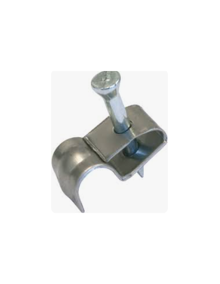 Fixation par clou béton montée sur le pontet. Pose au marteau. À la mise en oeuvre, la languette supérieure lors de la fixation referme la partie cylindrique du pontet et augmente ainsi la capacité de maintien autour du câble