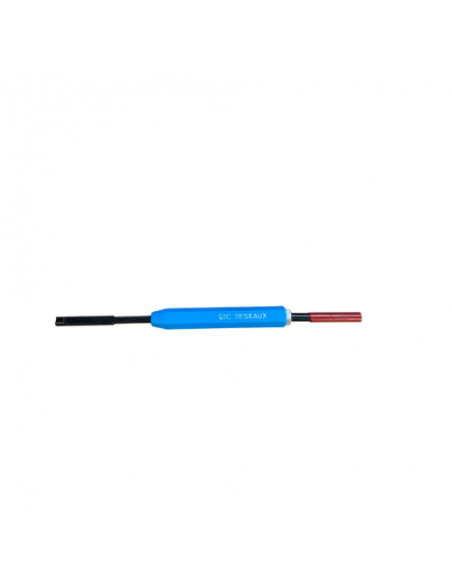 Outil double fonction avec poignée ergonomique et embouts interchangeables, permettant d'enrouler et dérouler les fils sur les bornes de connexion des équipements télécoms et réseaux sans soudure.