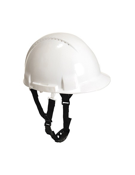 Casque ventilé, adapté pour travailler en hauteur. Coquille en polyéthylène très confortable, harnais à six points et réglage de la boucle. Fourni avec bande anti transpiration et mentonnière 4 points (style Y).